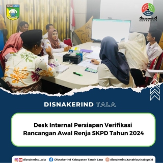 02 Februari 2023 Disnakerind Tanah Laut DISNAKERIND 315 xRabu, 01 Februari 2023 telah dilaksanakan Desk Internal Persiapan Veridikasi Rancangan Awal Renja SKPD Tahun 2024 bertempat di Ruang Kepala Dinas Tena...